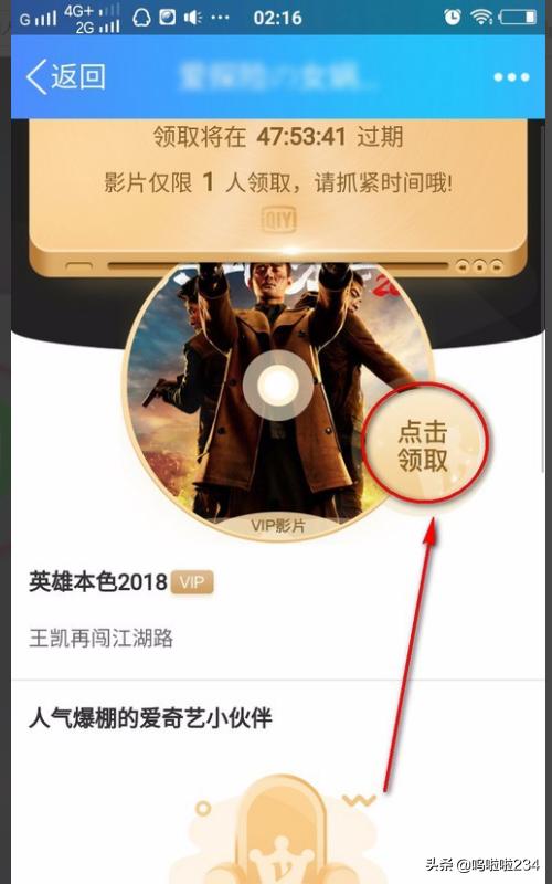 7、这样就赠片成功了。对方要观看,就打开你则才发送的链接,点击领取,再登陆自己的爱奇艺账号,就可以免费观看你赠送的VIP电影了。