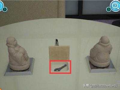 5、点击房间左上角茶几,放入笔和两个佛像,使左边佛像看右边,右边佛像看上面,点击笔,打开暗格,获得钥匙。