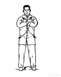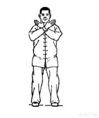23、十字手:转体扣脚、弓步分手、坐腿扣脚、收脚合抱。