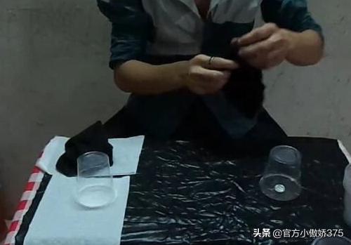 10、再将左边的杯子和黑布一起拿起来,发现硬币在左边杯子的下面。