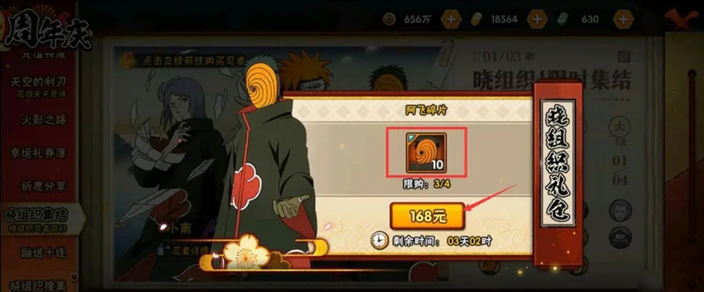 2、而在1月1日时,周年庆的晓组织集结活动中,晓组织全员回归,阿飞也在作为晓组织的一员回归在游戏中了,1月1日-1月6日限时购买。