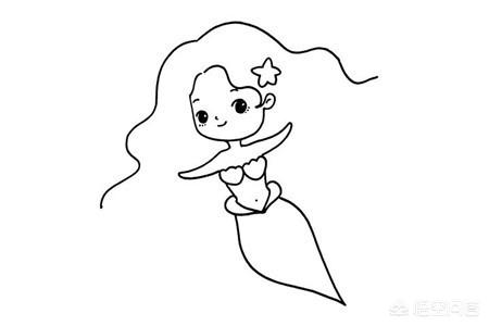 在画好的面部下方延伸线条画出美人鱼的脖子以及展开的手臂及身体,注意小美人鱼是女生,需要在胸口画两个贝壳,一直画到腰部的位置就可以延伸线条画出一条漂亮的鱼尾了