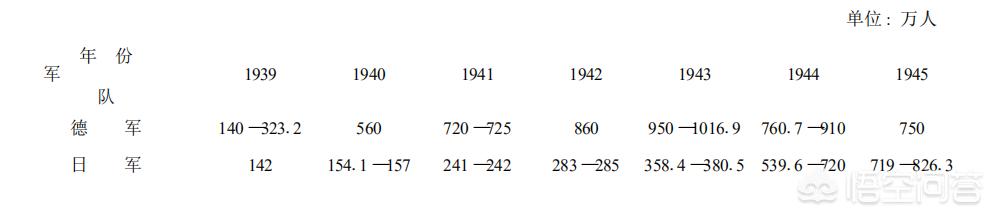 从这合格表中我们可以看出二战期间,德军兵力最多的年份是1943年,达到了1016.9万人;日军兵力最多的是1945年,达到了826.3万人。